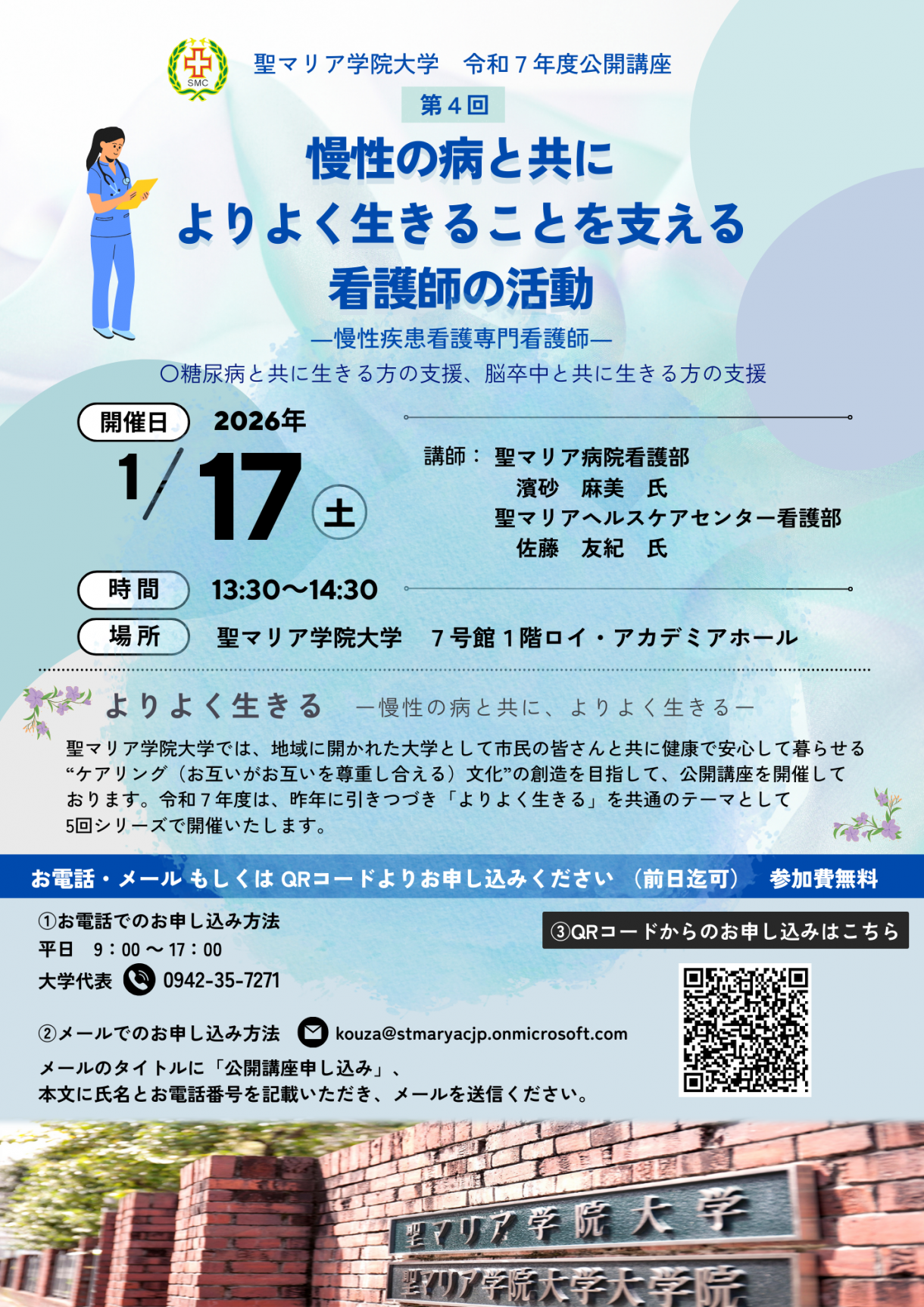 「慢性の病と共によりよく生きることを支える看護師の活動~糖尿病と共に生きる方の支援、脳卒中と共に生きる方の支援~」をテーマに、慢性疾患看護専門看護師が講演を行います。受講料は無料でどなたでも参加可能です。お申込みお待ちしております。詳細はチラシを参照ください。会場案内地図