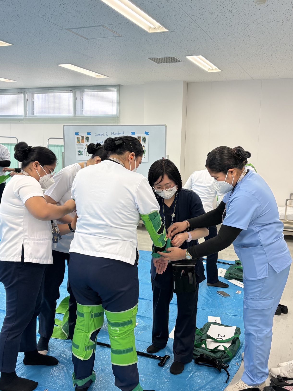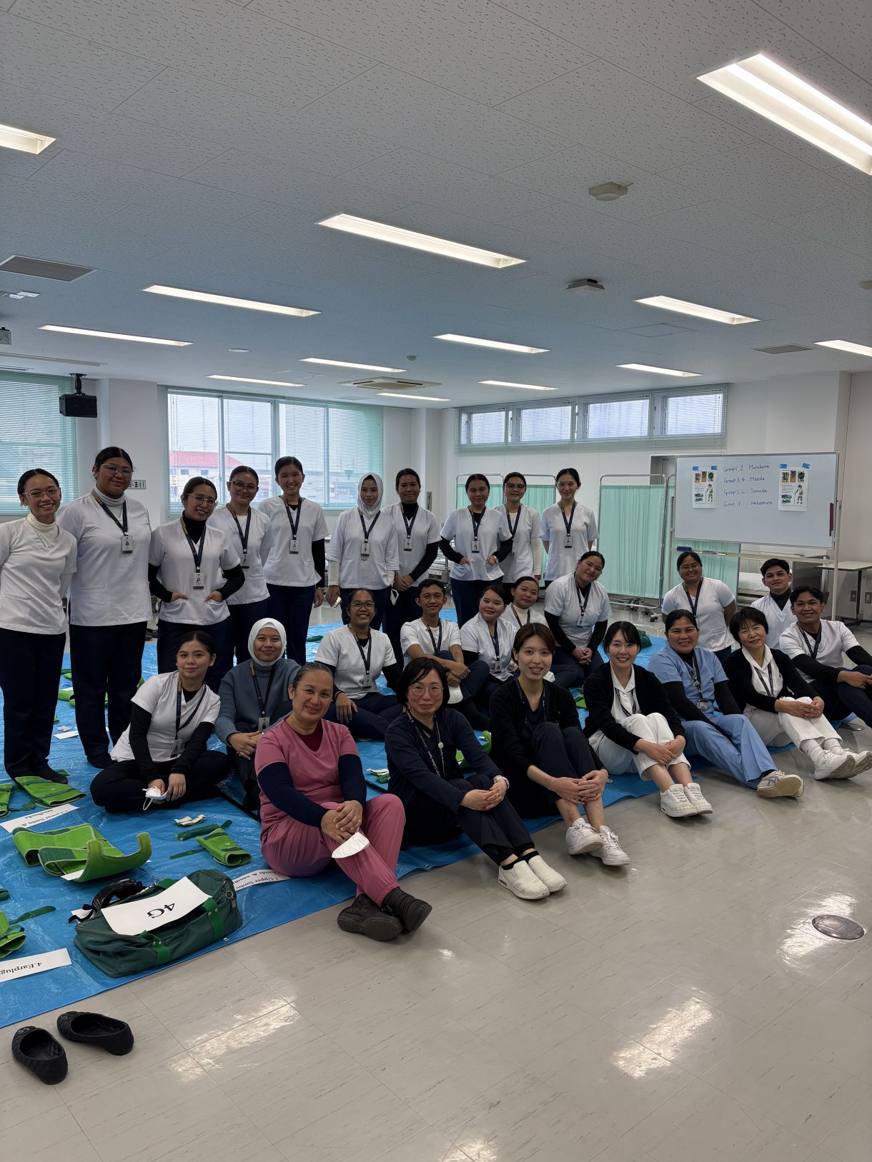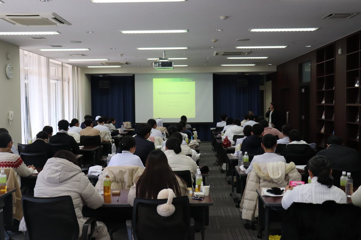 今回の研修では、高齢化が進む日本の保健医療制度や介護保険制度、また老年看護学等に関する講義を受講した後、高齢者の疑似体験をしたり、グループ施設であるメゾンマリア(グループホーム、デイサービス)で現場を見学することで、高齢社会におけるケアについて認識を深めました。