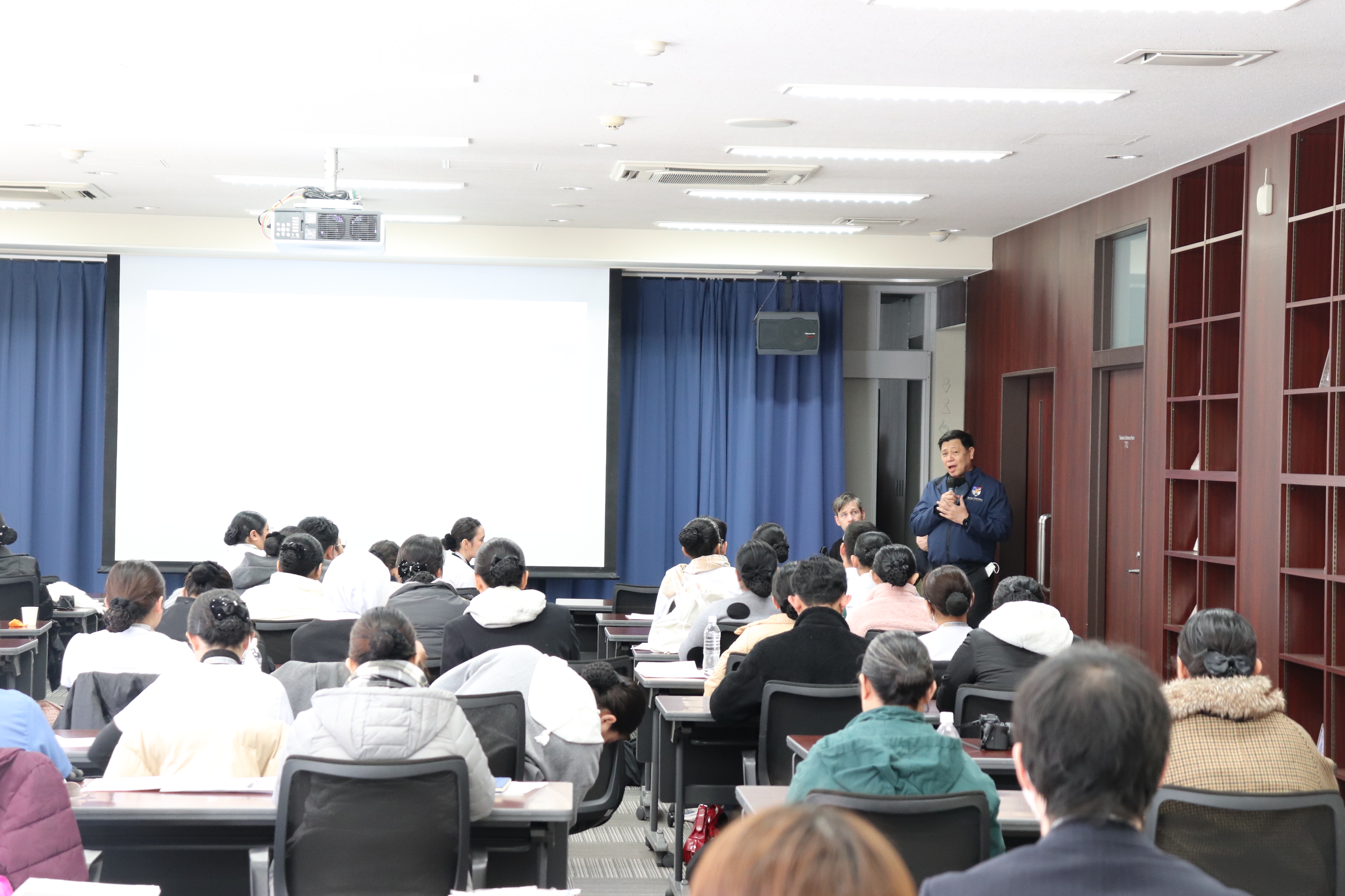 姉妹校であるザビエル大学(Xavier University – Ateneo de Cagayan)より、大学間交流協定に基づく学生交流事業として、去る1月28日(水)から1月30日まで、学長、看護学部長含む7名の教員と38名の学生さんの総勢45名が研修でお見えになりました。