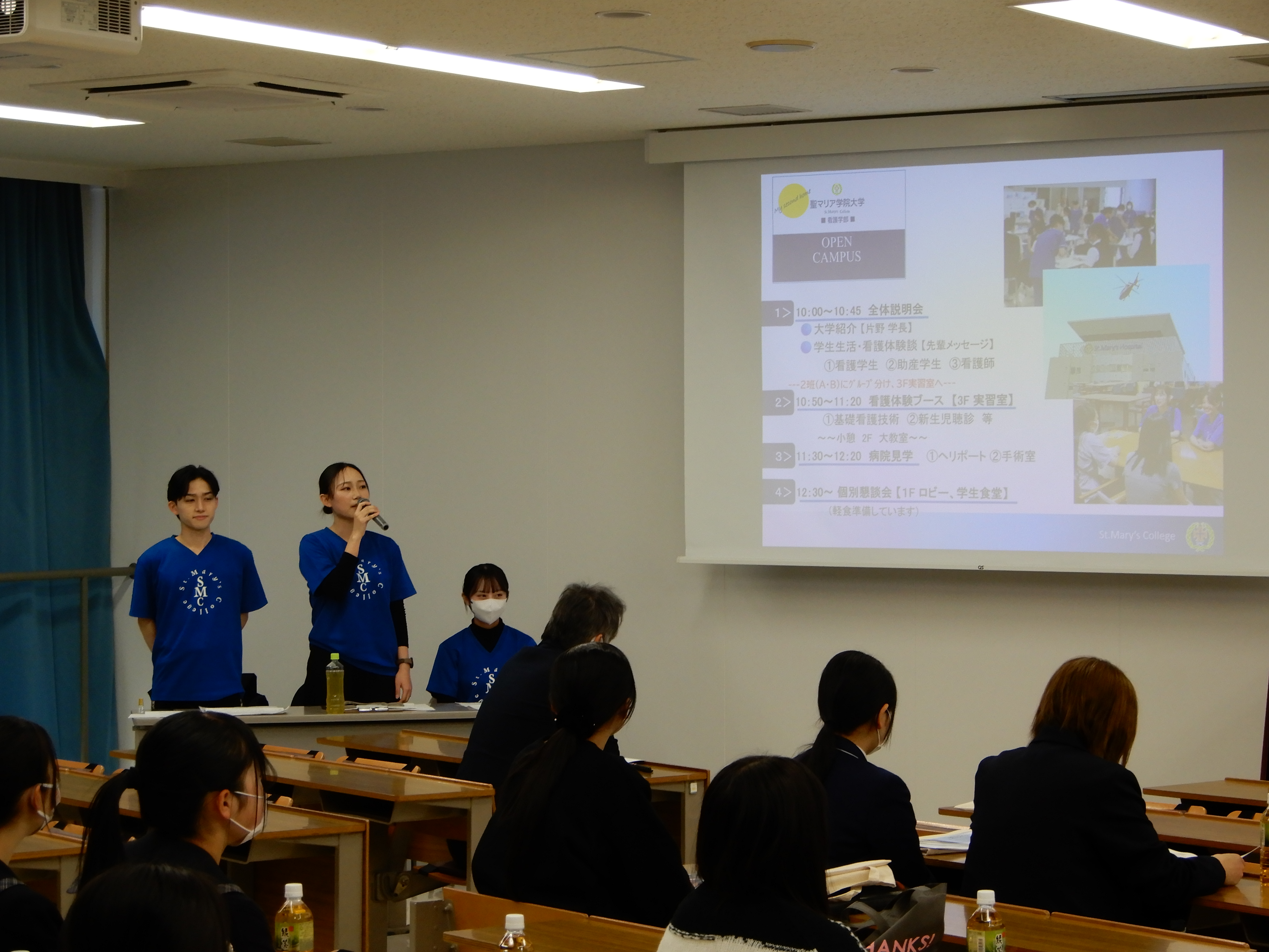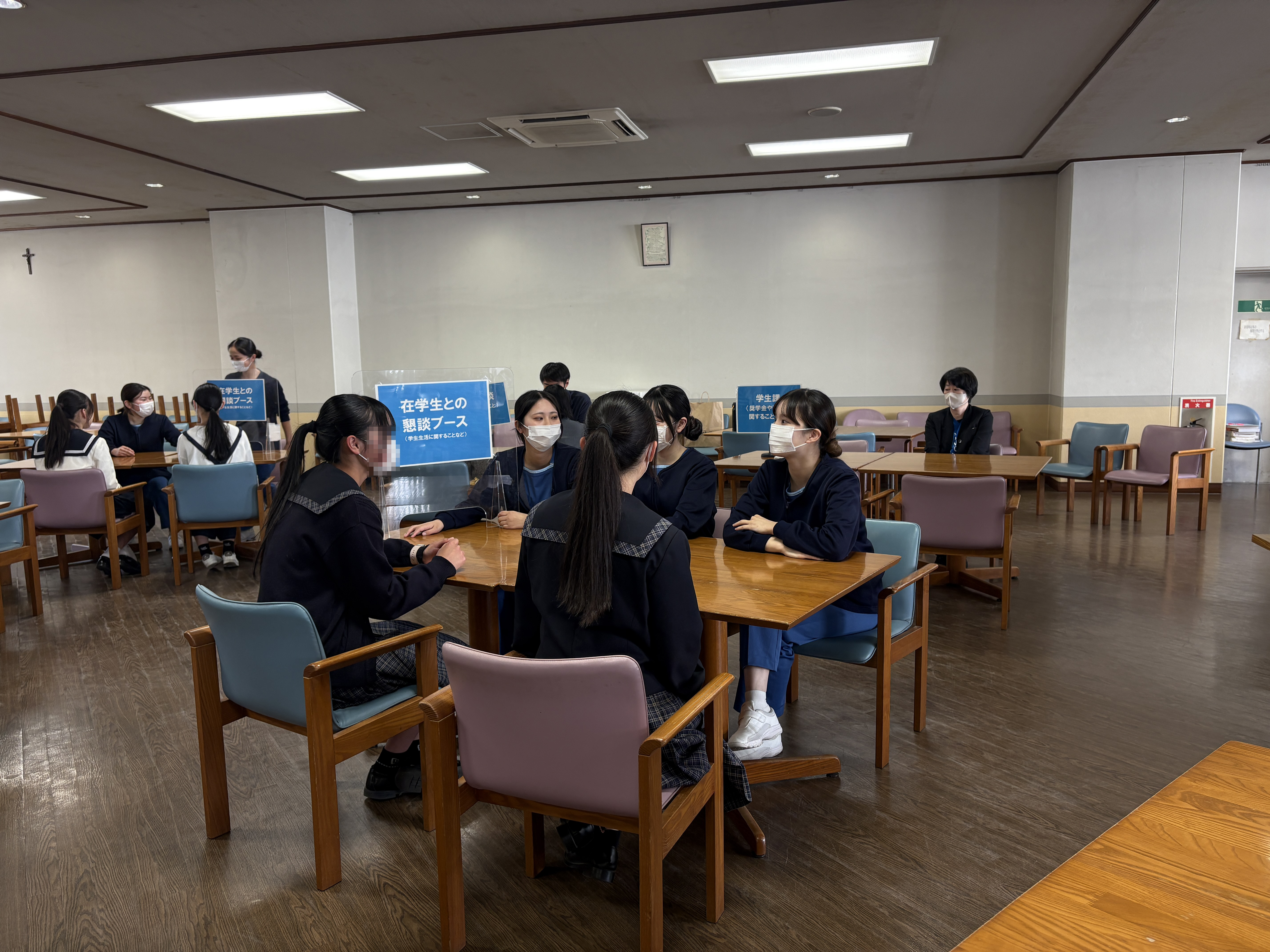 本学の紹介に加え、看護の体験学習、臨地実習施設である聖マリア病院の見学、国際看護や保健師に関する展示、在学生との懇談や各種相談コーナーを設置しました。